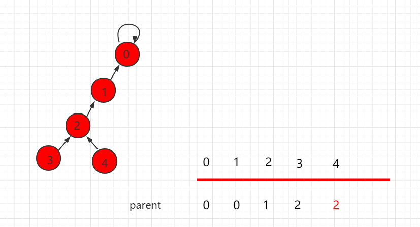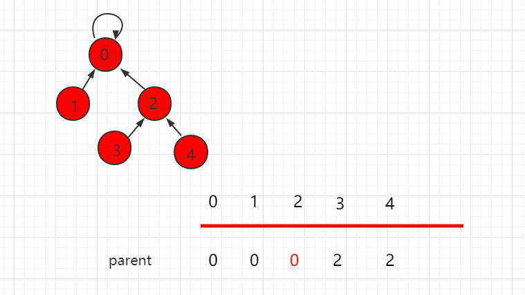 节点 2 向上寻找,也不是根节点,那么把元素 2 指向原来父节点的父节点,操后后树的层数相应减少了一层,同时返回根节点 0。
